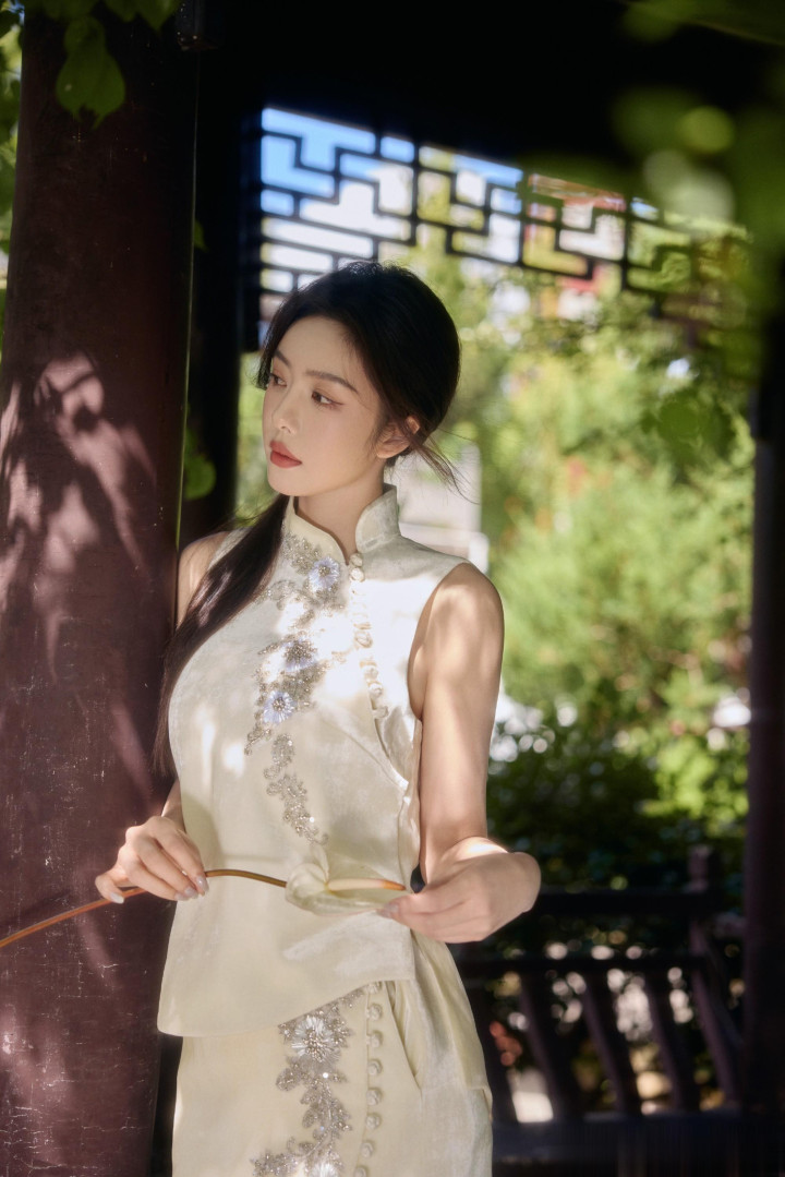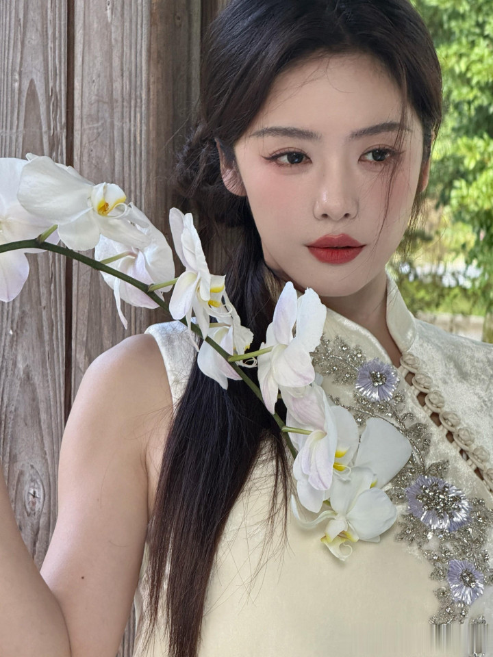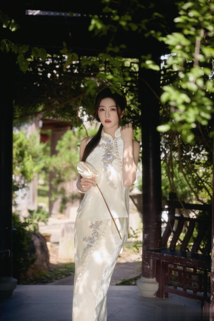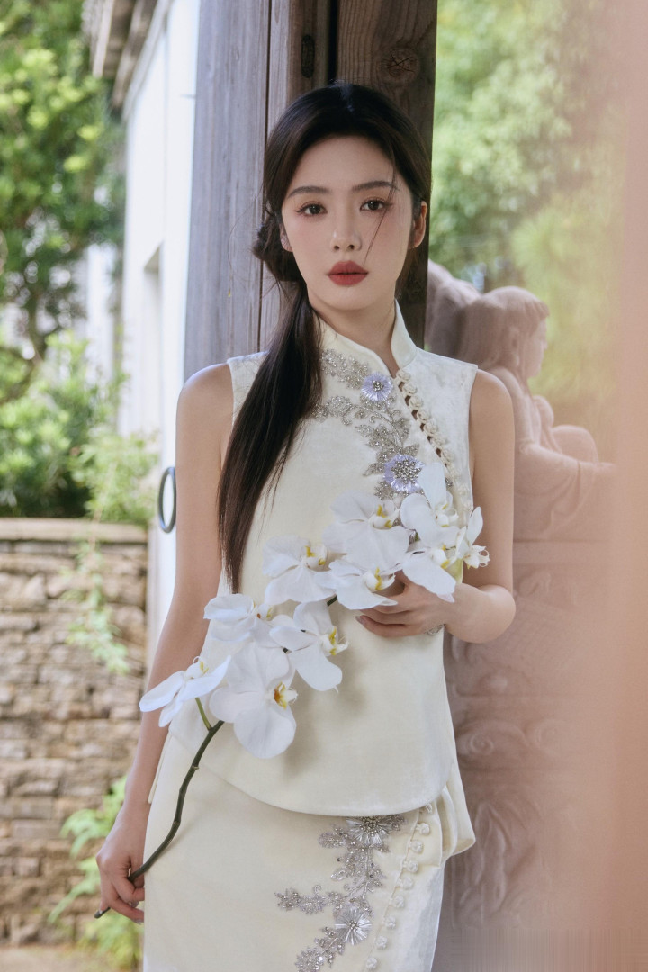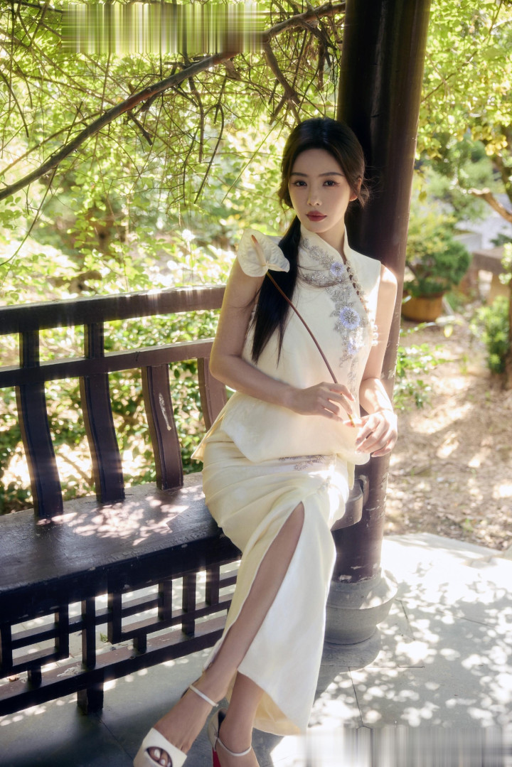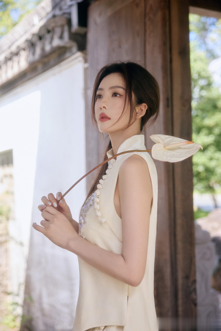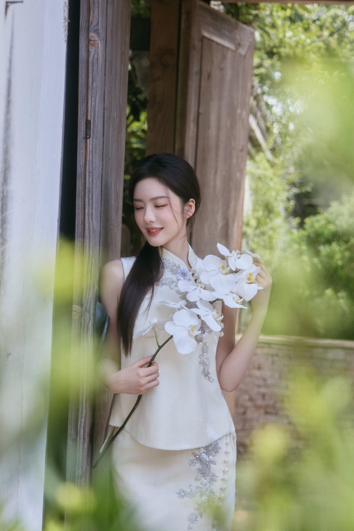 蔡文静国风旗袍写真: 白兰萦绕, 一颦一笑皆藏东方雅致韵味