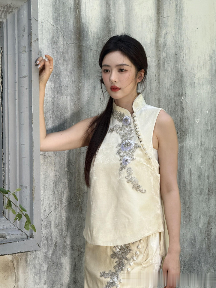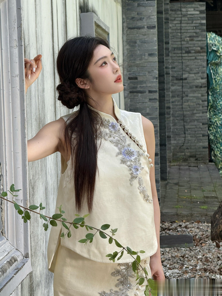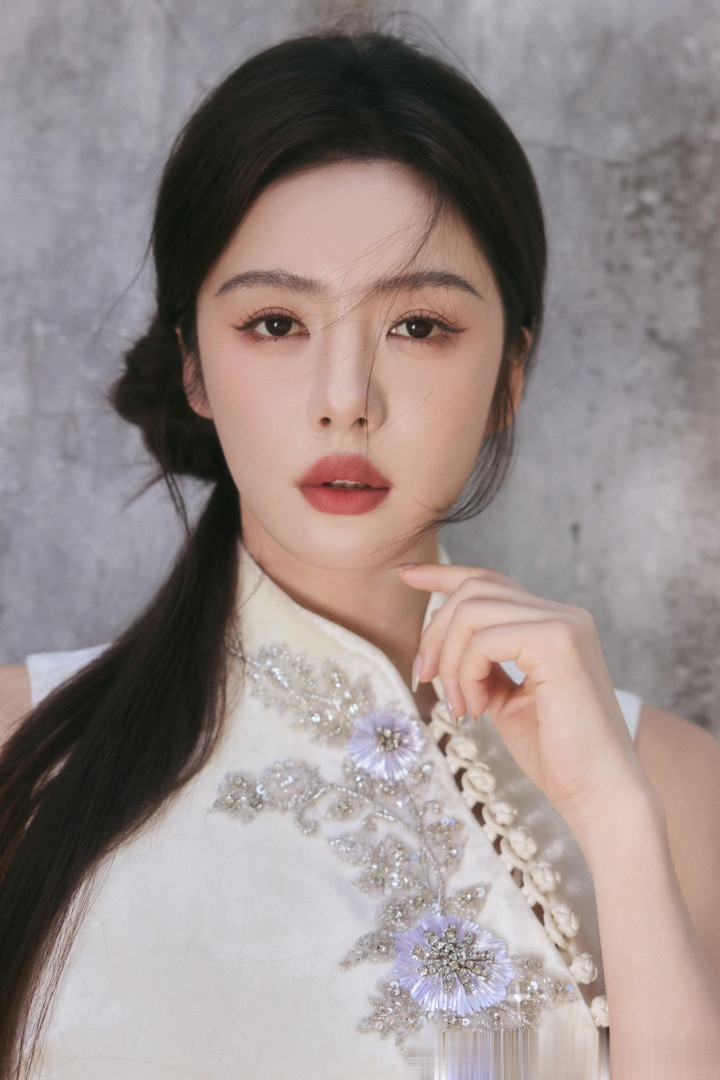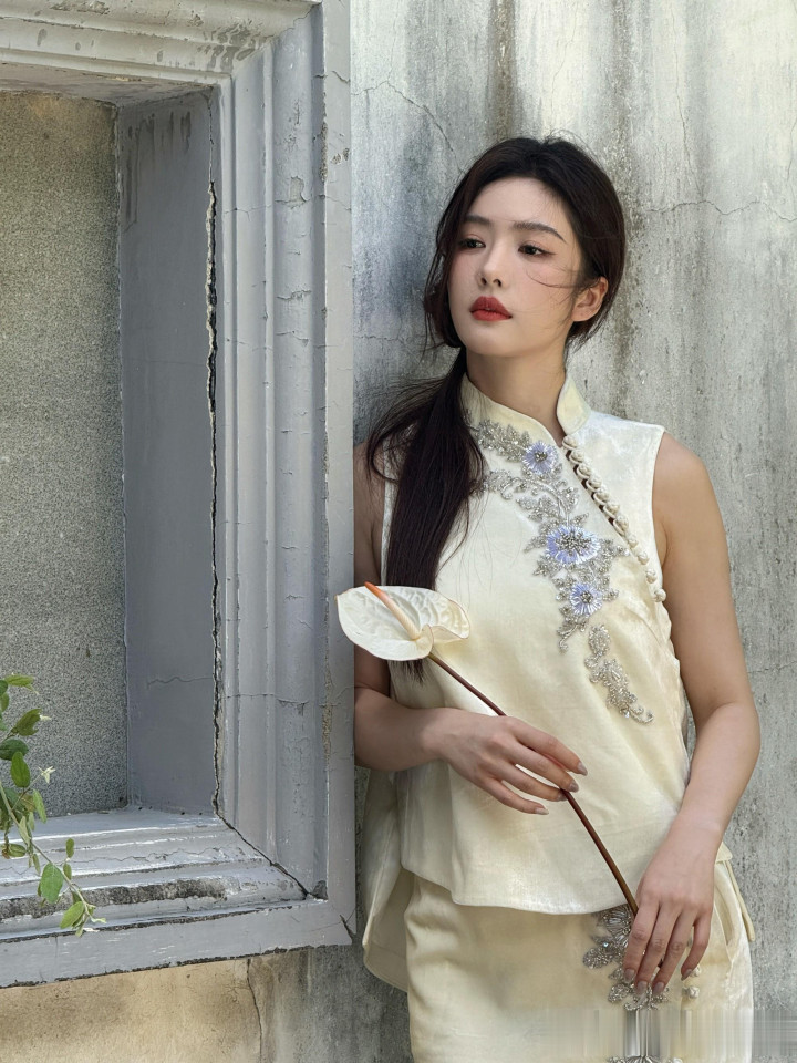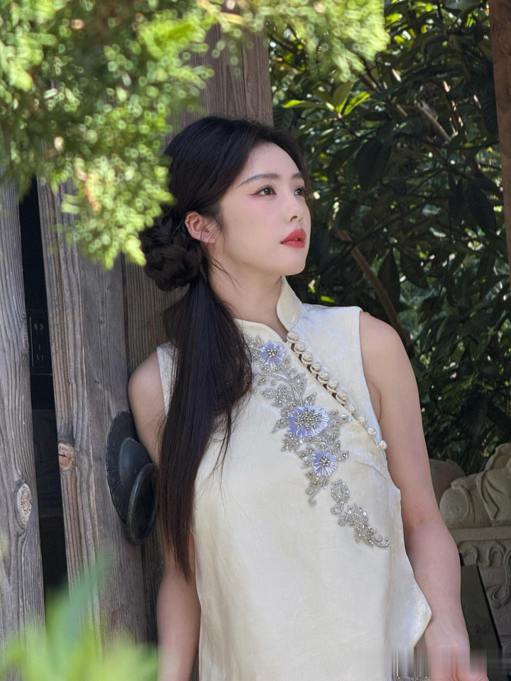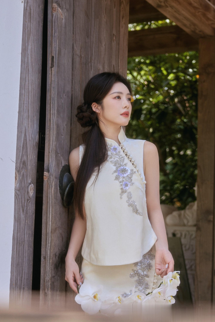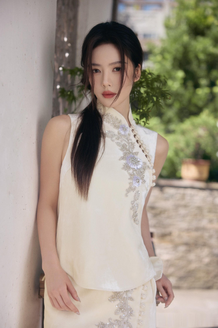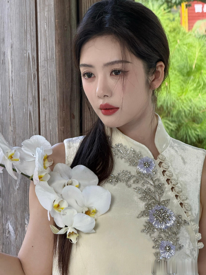蔡文静国风旗袍写真: 白兰萦绕, 一颦一笑皆藏东方雅致韵味
